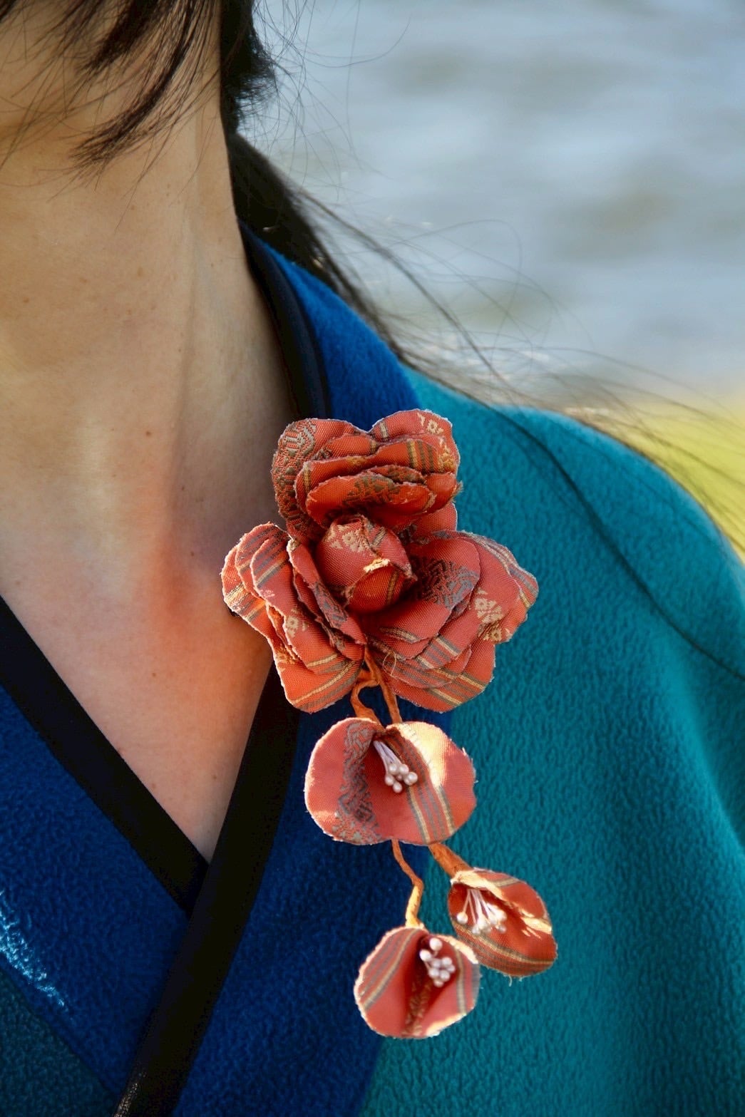 今回ご紹介するのは、博多織のコサージュ作品。旅のご縁から生まれた唯一無二の一点物です。