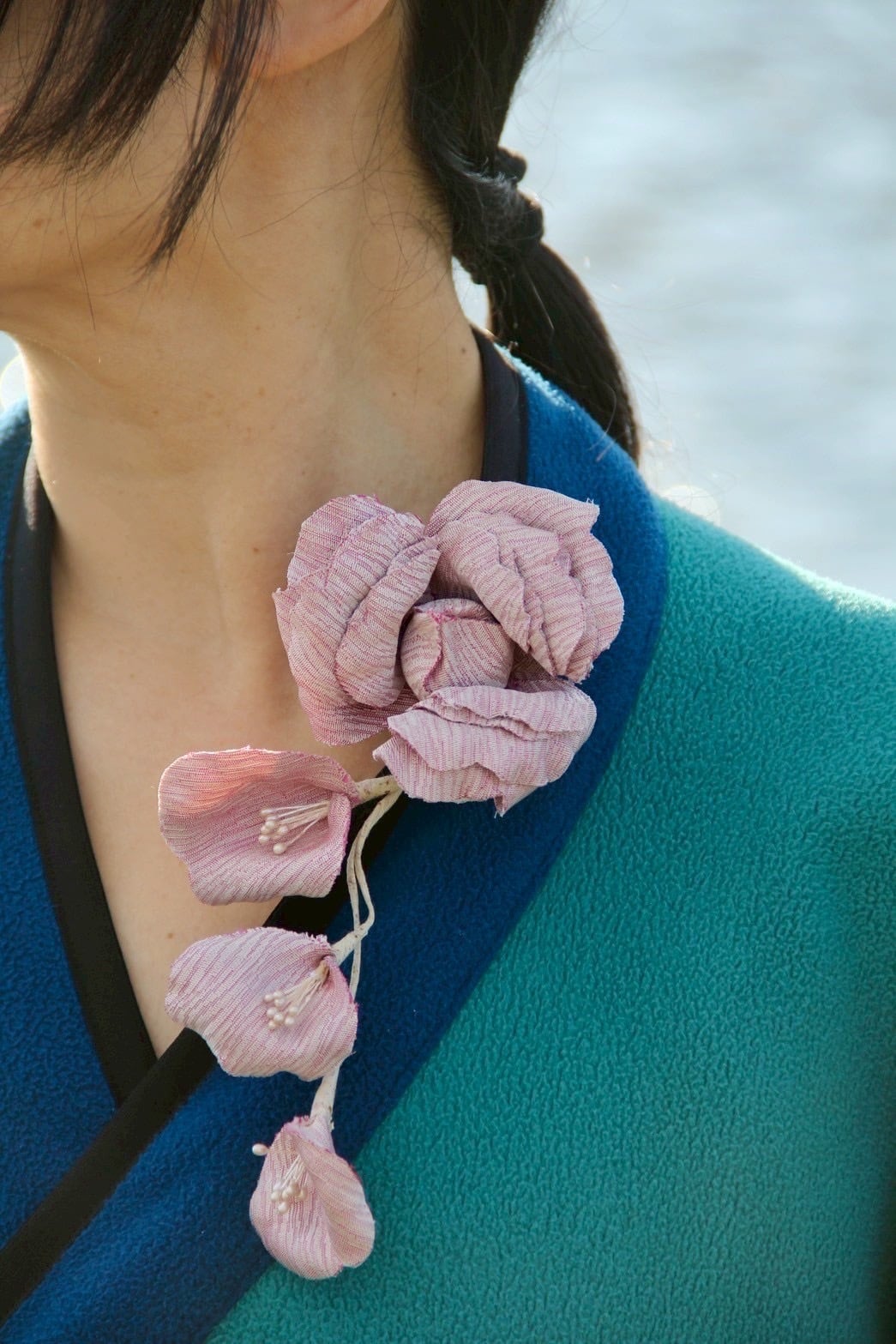 今回ご紹介するのは、博多織のコサージュ作品。旅のご縁から生まれた唯一無二の一点物です。